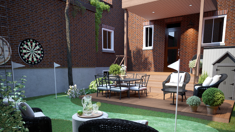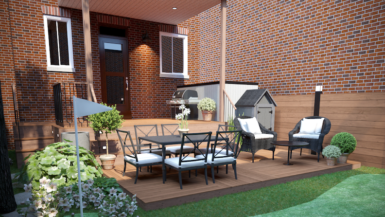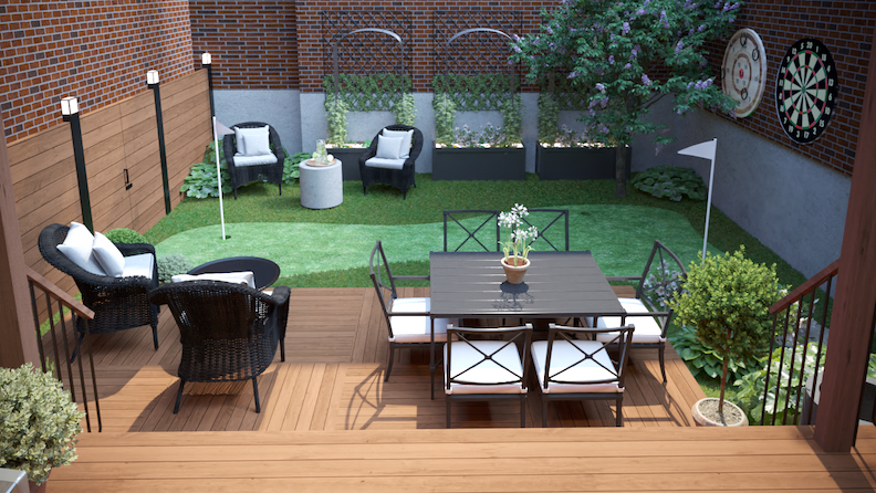 Needs ContentUne cour repensée autour d’un gazon synthétique plus vrai que nature d’une terrasse en cèdre signée Clic Patio, et de mobilier haut de gamme fourni par Jardin de Ville. Des plantations adaptées à l’ombre complètent cet espace où ils peuvent enfin vivre à l'extérieur.