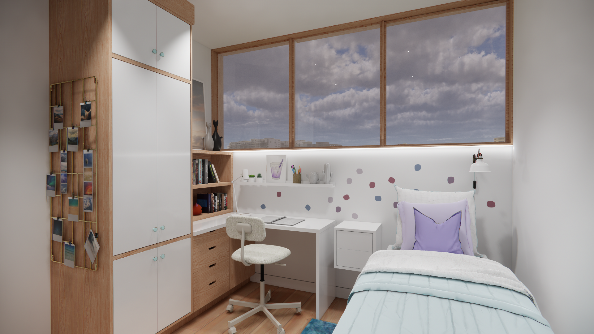 Pour chaque chambre, il fallait aménager un bureau et une garde-robe dans des espaces particulièrement étroits, tout en tenant compte de la fenestration mur à mur.